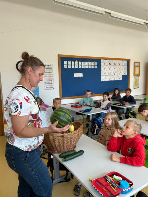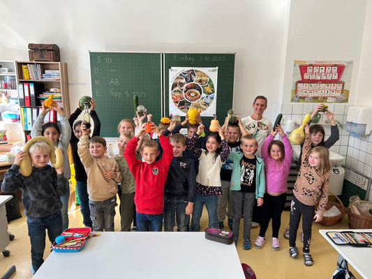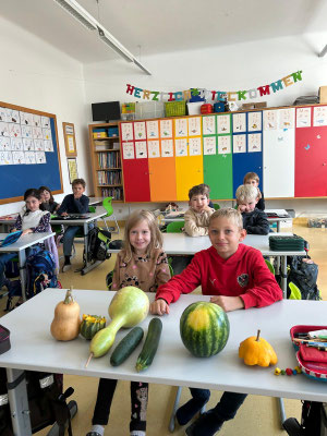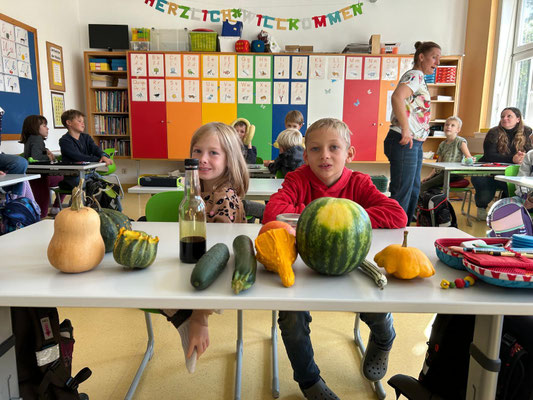 Die Kinder lernten verschiedenste Kürbissorten kennen, erfuhren Wissenswertes über den Anbau, die Ernte und die Verarbeitung von Kürbissen sowie über Qualitätssiegel und Biozeichen.