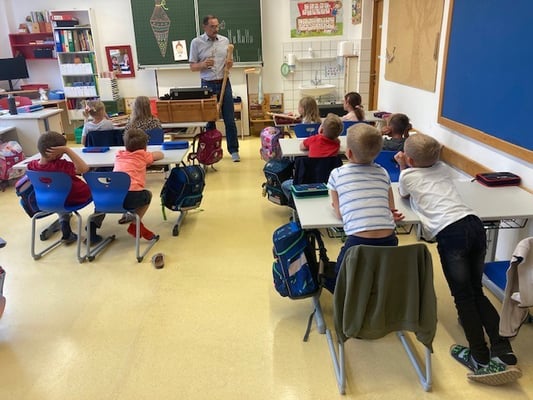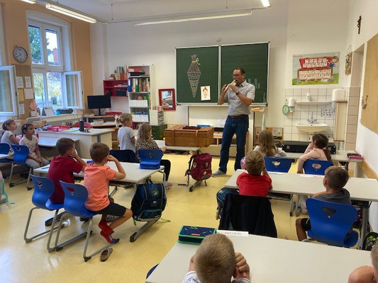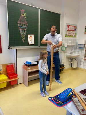 In der ersten Schulwoche stellte Musikschuldirektor Mag. Dr. Karl Hermann den Kindern der ersten Klassen die Blockflötenfamilie vor. Von der kleinen, hellklingenden Sopranflöte bis hin zur tiefen, eindrucksvollen Bassflöte konnten die Schülerinnen und Schüler die verschiedenen Instrumente kennenlernen. Die ganz mutigen durften auf einzelnen Flöten sogar ein paar Töne spielen. Ein Dankeschön an Herrn Hermann für diese interessante Musikeinheit.