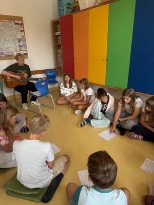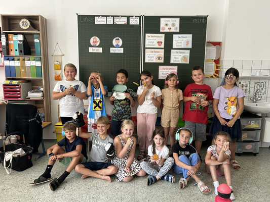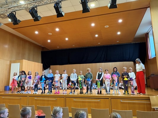 Am ersten Schultag wurden unsere Schulanfängerinnen und Schulanfänger im kleinen Kultursaal mit ihren Eltern herzlich begrüßt. Die 3b Klasse hatte zwei Lieder vorbereitet, die ihnen zeigen sollten, dass Schule richtig Spaß machen kann.