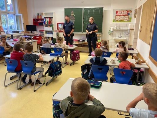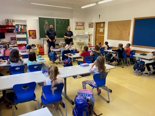 In der ersten Schulwoche hatten die beiden ersten Klassen Besuch von der Polizei. In den Klassen erklärten die Polizisten ihnen das ordnungsgemäße Verhalten im Straßenverkehr. Anschließend ging es auf die Straße, wo das richtige Gehen am Gehsteig und das Überqueren der Straße geübt wurden. Ein Dankeschön an Frau Monika Weber und Herrn Alexander Neubauer von der Polizei Fehring.